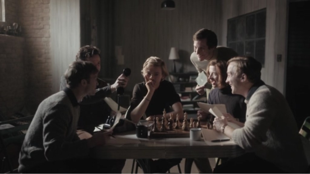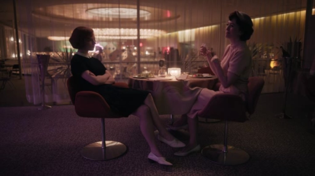 Nous sommes en 1968. À aucun moment du récit, on aura entendu parler de la Guerre Froide, de la guerre du Vietnam ou d’émeute raciale. Tout juste comprend-on que les Soviétiques ne sont pas des amis. Le monde que l’on nous rappelle, celui des années 50-60, n’existe qu’au travers des costumes, des décors intérieurs et des voitures immaculés que l’on nous cite à foison. Pas un collant filé ni de rayure sur une carrosserie et encore moins de lynchage dans ce bel Etat du Kentucky. Il est tendance, ces derniers temps, d’aller piocher dans le classicisme américain (Ratched, Project Blue Book) mais c’est, dans le cas de The Queen’s Gambit, au prix d’un parfait mutisme sur la violence sociale et le racisme de l’époque. Les magazines de mode, évidement, enfoncent le clou. Beth, envoie même paître une Ligue chrétienne anti-communiste qui voudrait la recruter, quitte à perdre d’importants financements, elle ne croit pas en la politique, ou plutôt, les scénaristes n’ont pas envie de sortir des limites d’un cadre étroit : l’émancipation d’une femme au travers du jeu d’échecs.
