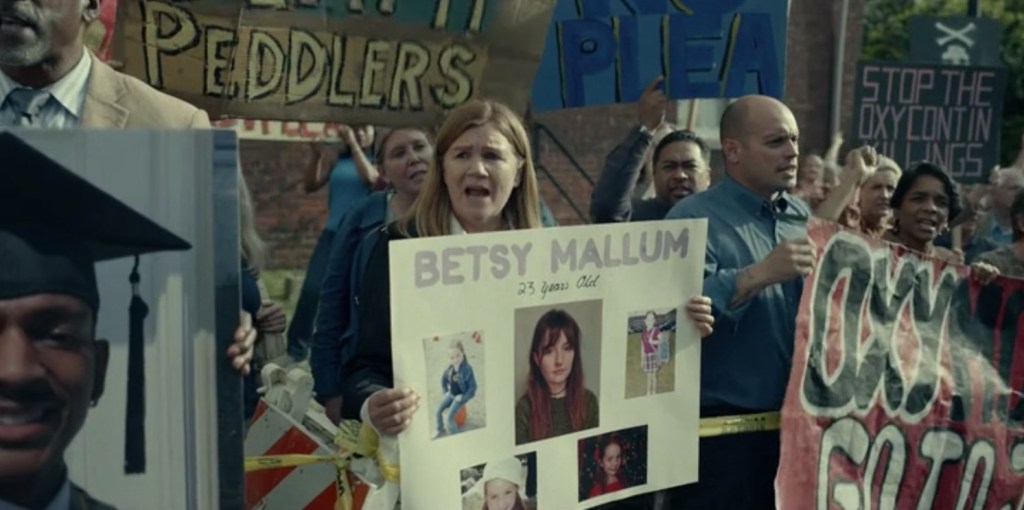 Dopesick suit sept personnages principaux : Richard Sackler, le responsable du lancement de l’OxyContin et plus tard PDG de Purdue Pharma, le docteur Finnix qui se laisse convaincre de prescrire l’OxyContin à ses patients et finit par en prendre lui-même à la suite d’un accident, Rick Mountcastle et Randy Ramseyer, un duo d’adjoints du procureur, Bridget Meyer une agent de la DEA (3), Betsy Mallum une jeune ouvrière victime d’un accident du travail et Billy Cutler, un vendeur de Purdue Pharma. Soit deux personnages du côté de l’industrie pharmaceutique, trois du côté de la justice et deux victimes, pour un récit choral qui donne une vision presque complète du sujet.