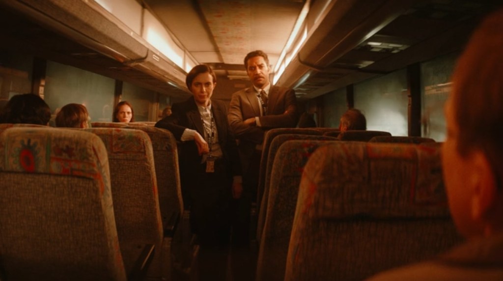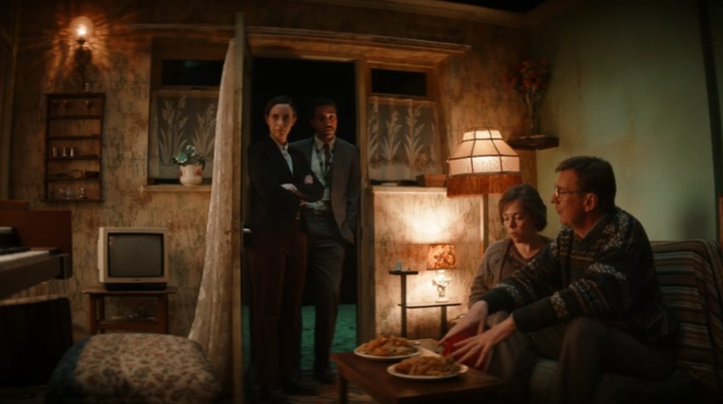 Au cours du troisième épisode, la mise en scène illustre parfaitement l’articulation entre ce qui relève de la réalité ou du simulacre. La rupture survient d’une façon inattendue lors des interrogatoires de Susan menés par l’inspectrice Lancing et son collègue. Après nous avoir montré le « public » de l’interrogatoire au moyen d’un effet d’éclairage et alors que l’entretien s’englue, l’inspectrice se lève et sort brusquement de la salle d’interrogatoire non pas par la porte mais par une ouverture dans le décor. Susan et l’autre policier la suivent et l’on voit les personnages déambuler au travers du studio en direction d’un autre décor qui représente l’appartement des parents de Susan et dans lequel ils se retrouvent confrontés à leurs victimes ressuscitées et à l’inspectrice pour la reconstitution de la scène du double meurtre.