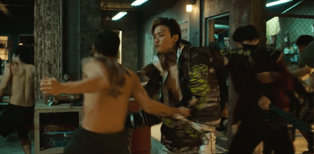 La première impression est celle d’un récit organisé autour de séquences d’une rare violence physique. Violence entre les gangs, violence entre les gangs et la police, violence entre les individus au travers de combats à mains nues, au couteau ou au sabre. À raison de deux affrontements sanglants par épisode, les bagarres individuelles comme les batailles rangées sont loin d’être ces ballets que suggèrent ceux qui en parlent comme de « chorégraphies ». Il est même probable que, du fait de leur vitesse et de leur brutalité, ces trop longues séquences nous atteignent moins qu’il n’y paraît. Impossible de les « absorber », de les faire nôtres comme nous faisons nôtre ce que nous font vivre ordinairement les images de cinéma ou de télévision. Narrativement, ce ne sont que des mises au point, des scènes dont la fonction est de déterminer où le récit en est arrivé, avant de le relancer. On règle les comptes et l’on poursuit sur des bases renouvelées. Tout cela se déroule très vite, avec quantité de sang et d’égorgements. On peut préférer, c’est vrai, l’épure des grands films de sabre japonais.