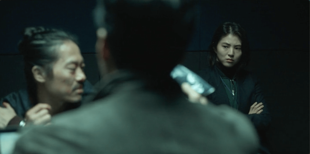 Après un brutal entraînement chez les apprentis hommes de main de Dongcheon, Yoon Ji-woo intègre la police sous la fausse identité d’Oh Hye-jin. Infiltrée à la brigade des stupéfiants, elle est chargée de prévenir Choi Mu-jin de toute opération que tenterait la police à son encontre. Parallèlement à cette mission, il s’agit pour elle d’identifier le policier qui a assassiné son père. La tension du récit repose sur la fragilité de la couverture de l’héroïne et le risque permanent qu’elle soit découverte. Là encore rien de très neuf, ce n’est pas la première histoire de taupe que l’on rencontre au cinéma ou à la télévision. (2)