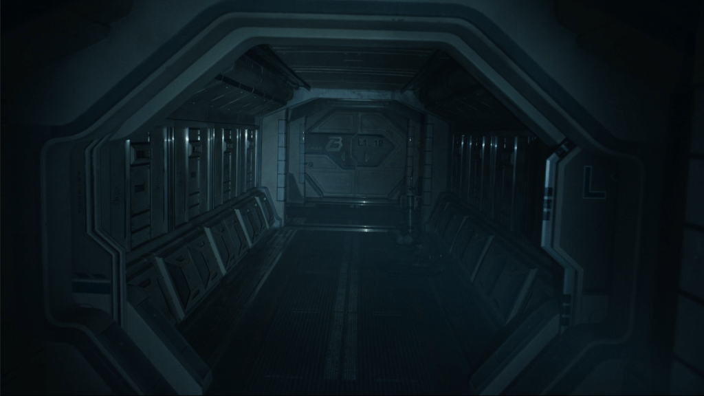 Puisque j’évoque un labyrinthe, il est nécessaire de s’attarder sur l’espace dans lequel évoluent les personnages, c’est-à-dire sur la conception architecturale de la station lunaire, bâtie à flanc de crevasse, ce qui est un bon choix pour se protéger des rayonnements des éruptions solaires. L’intérieur s’organise en couloirs à angles droits menant au terme de longs trajets à des chambres individuelles, des espaces de travail ou d’immenses réserves d’échantillons. Mais lorsque à l’exemple des astronautes, on choisit de parfois passer par les conduits d’aérations, à peine plus étroits que les couloirs, le labyrinthe se double d’un second, plus strictement géométrique encore. Impossible de s’y retrouver sans un appareil comme ceux que les astronautes portent à leurs poignets.