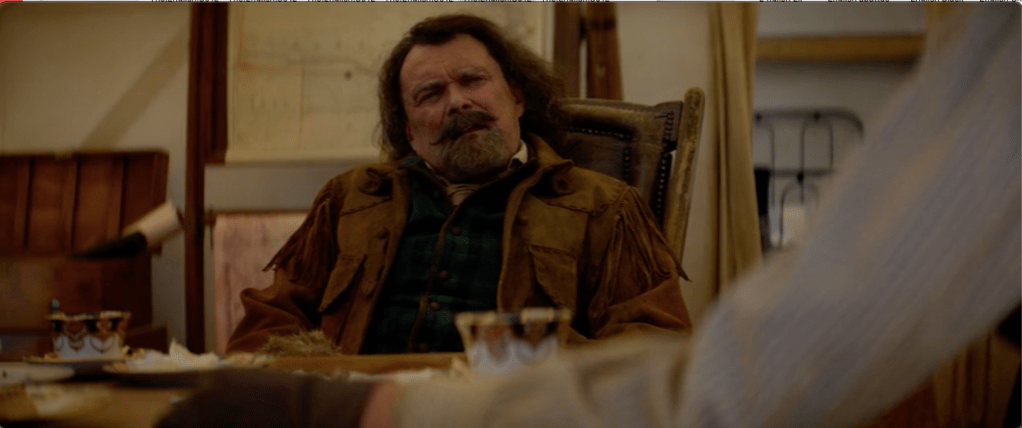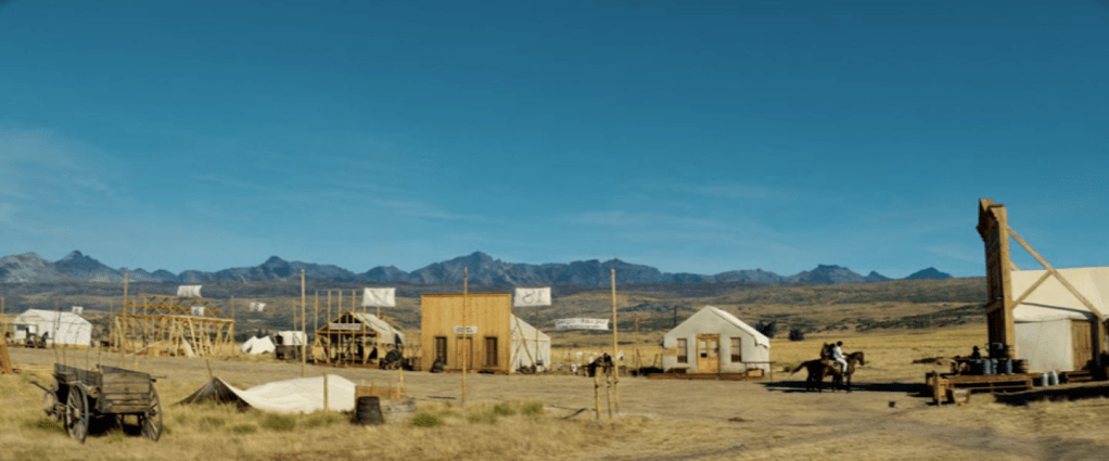 Ce syndrome de l’incomplétude ne touche pas seulement les personnages. Les décors eux-mêmes en sont atteints et l’un d’entre eux particulièrement : le village inachevé où les rares habitants des environs viennent consulter le shériff ou acheter leurs outils et dont les façades dissimulent des toiles de tentes, comme un décor extérieur de cinéma en construction. Récit en construction dans un décor en construction, tel est The English.