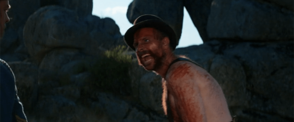 C’est, par exemple, une patrouille de cavaliers en uniformes, voleurs et assassins supposés, qui reçoit l’aide de Malmont, le contremaître de Thomas dans sa traque d’une tribu cheyenne. Eli ne se joint pas à eux, ce n’est pas son affaire, comme on l’a dit. Quelque temps plus tard, on entend au loin la mitrailleuse qui hache hommes, femmes et enfants. Au retour du petit groupe de soldats, Malmont, à demi dévêtu et rouge de sang, se met à gronder et montrer les crocs comme un loup devant le Pawnee imperturbable. La mitrailleuse rappelle l’ordre technique évoqué par Bazin, le sang étalé sur le corps et le comportement animal désignent la folie.