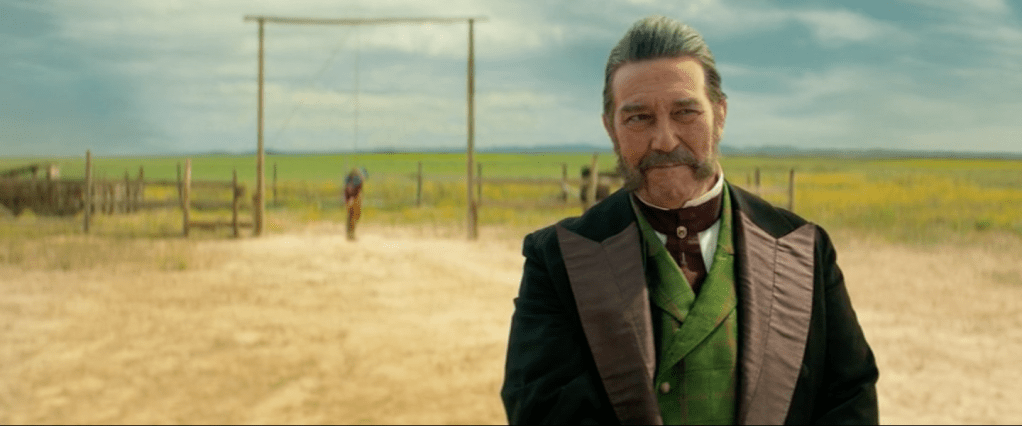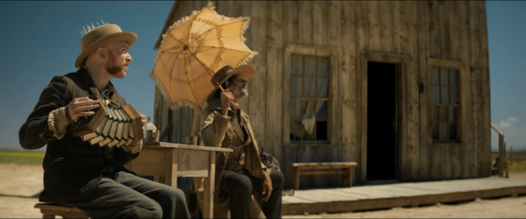 L’attelage d’une aristocrate anglaise et d’un Indien solitaire est à l’opposé des héros canoniques des westerns classiques probablement d’origine irlandaise, souvent marginaux et toujours masculins et blancs (2). Pour le décor, en revanche, tout y est : le village en bois planté dans un désert poussiéreux, les horizons infinis, les hordes indiennes fuyantes, les vétérans de la Guerre de Sécession devenus bandits de grands chemins, la terre inculte, le bétail volé, la diligence arraisonnée… Tout y est, en effet, mais sous forme de citation, par fragments isolés et plantés arbitrairement dans des paysages désolés, comme le trône d’un prince ou une datcha d’une famille russe sur une scène de théâtre. Par exemple, cet hôtel devant lequel Cornelia débarque de la diligence. Seul au milieu d’une plaine semi-désertique, avec, pour tout personnel, un aubergiste tout ce qu’il y a d’inquiétant. Deux pauvres hères passent la journée assis devant à jouer de l’accordéon, et un peu à l’écart, un Indien ligoté est suspendu après avoir été tabassé sans raison, voilà pour le décor. Nous sommes bel et bien dans un anti-western ou plutôt un post-western, genre fourre-tout qui accueille tout ce qui ne tient pas du western classique et qui est devenu la norme.