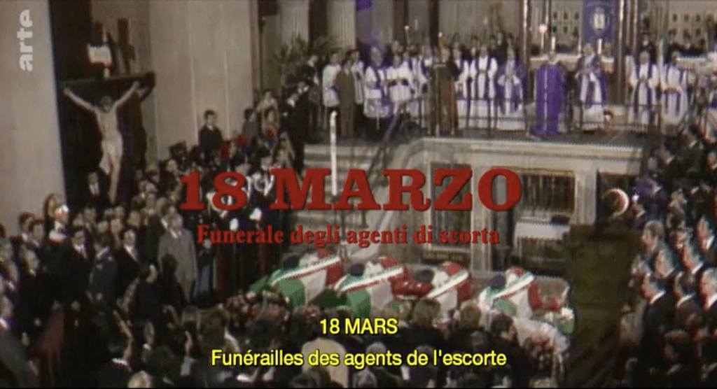 La séquence introductive est imaginaire. En réalité, elle n’a jamais eu lieu puisqu’on y voit Aldo Moro hospitalisé après son enlèvement par les Brigades Rouges et recevant la visite d’un aréopage de politiciens. On entend sa voix, off, prononcer les paroles de son ultime lettre. Six épisodes plus tard, les dernières images sont extraites de documents d’époque montrant la découverte de son corps dans le coffre de la 4L rouge, l’arrestation de brigadistes, etc… Entre les deux, l’histoire « vue par » (Le ministre de l’intérieur, le Pape, une brigadiste, la femme de Moro), c’est-à-dire la perception que chacun s’est fait de la réalité. L’imaginaire engendre la reconstitution fictionnelle qui engendre la preuve documentaire. Dans cet ordre. Autrement dit, l’ensemble du récit décrit une longue trajectoire entre ce qui aurait pu être mais ne l’a pas été jusqu’à ce qui a réellement été mais n’aurait jamais dû être.