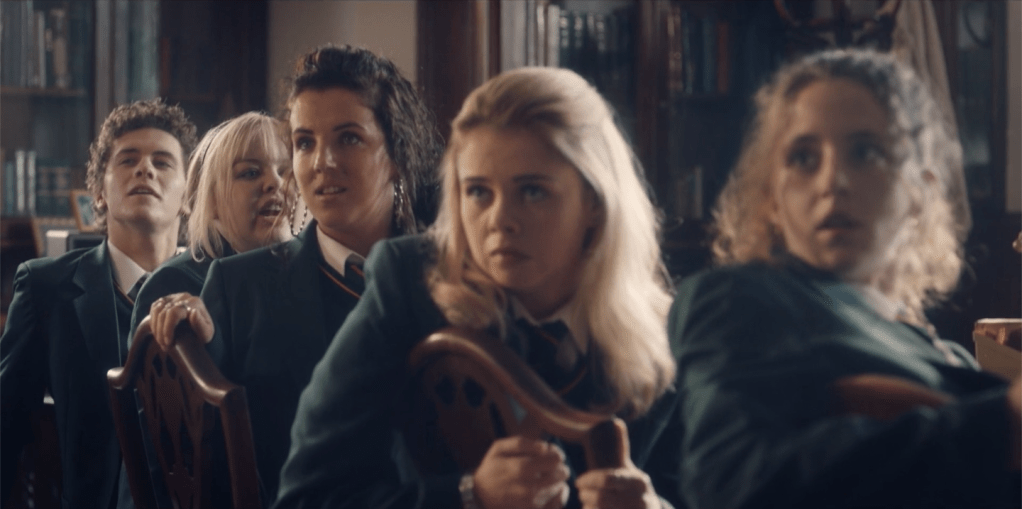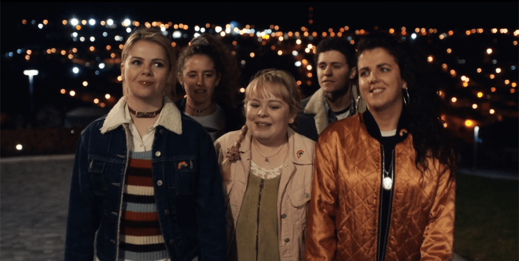 L’action se déroule à Derry, ghetto catholique de Londonderry, bien évidemment amputé de son « London ». L’héroïne, Erin (Saoirse-Monica Jackson), a des ambitions littéraires, un vif intérêt pour les garçons et un tempérament assez irritable, à l’opposé, sa cousine Orla (Louisa Harland), délicatement lunaire, tient l’indispensable rôle de la simplette parfois traversée d’illuminations. La copine Michelle (Jamie-Lee O’Donnell), la plus mûre des quatre filles, est aussi la plus arrogante, la plus portée sur le sexe et la plus téméraire, c’est elle qui entraîne systématiquement le groupe vers les ennuis. Son exact opposé, Clare (Nicola Coughlan) est studieuse, froussarde et tétanisée par l’autorité. Ces symétries seraient trop visibles sans la pièce rapportée, James (Dylan Llewellyn), le cousin anglais de Michelle, qui cumule, du fait de son sexe, de sa nationalité et de sa religion tout ce qui devrait ordinairement révulser les jeunes irlandaises.