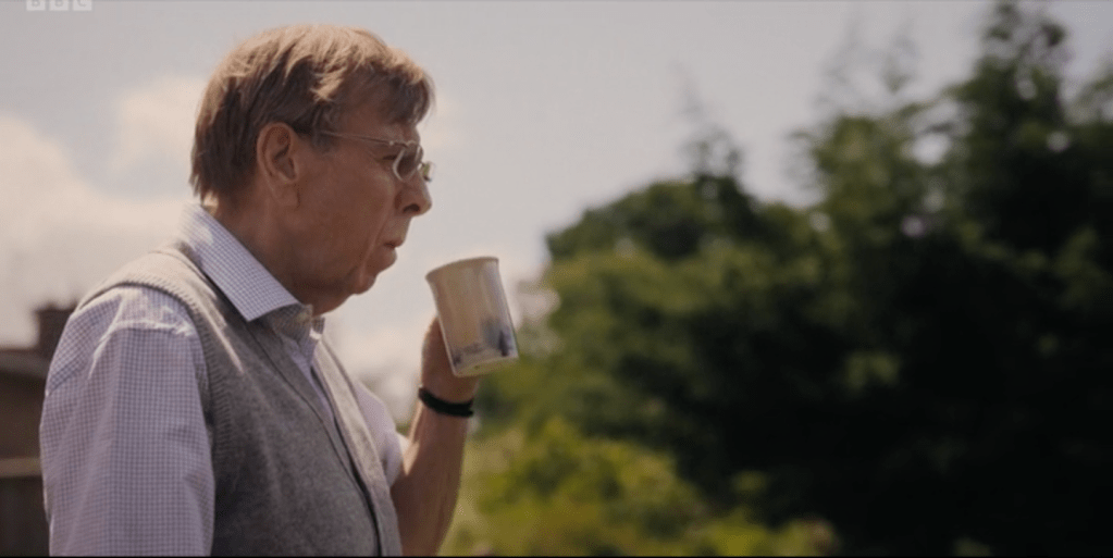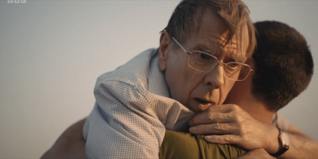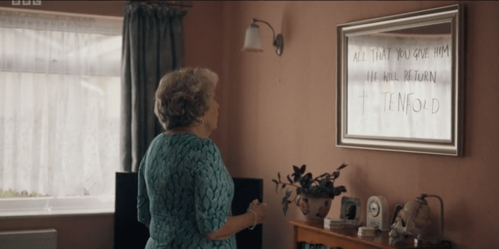 La qualité de marguillier et d’étudiant pasteur de Field rassurait indéniablement ses victimes. Ici, les dialogues habilement ciselés par Sarah Phelps, achèvent de les convaincre, tout autant que nous autres spectateurs, de la pureté des intentions de Ben Field. Du moins, en ce qui nous concerne, jusqu’à ce que son assiduité à apporter le thé à son ami Peter et les troubles qui s’ensuivent chez ce dernier, éveillent nos soupçons. À partir d’un moment impossible à situer, la tasse de thé devient à nos yeux l’arme d’un crime, elle matérialise le meurtre à l’œuvre, comme dans Notorious (Les Enchaînés) d’Hitchcock, les tasses de café à l’arsenic servies à Ingrid Bergman par Claude Rains. D’objet sans âme, elle devient signe. Il suffit d’un gros plan sur la tasse vide ou de la proposition de Field de servir une nouvelle fois le thé pour que nos alarmes s’accroissent au sujet du crédule professeur. Il en sera de même, plus tard, avec la trop naïve Ann. Liz Zettl, la dernière vieille dame de la liste concoctée par Fields, échappera heureusement au piège.