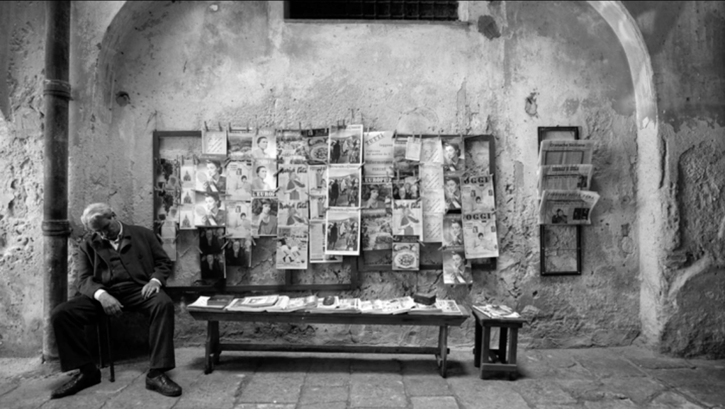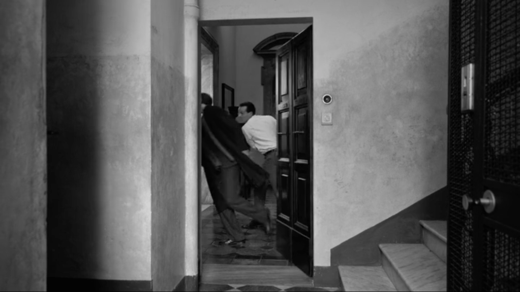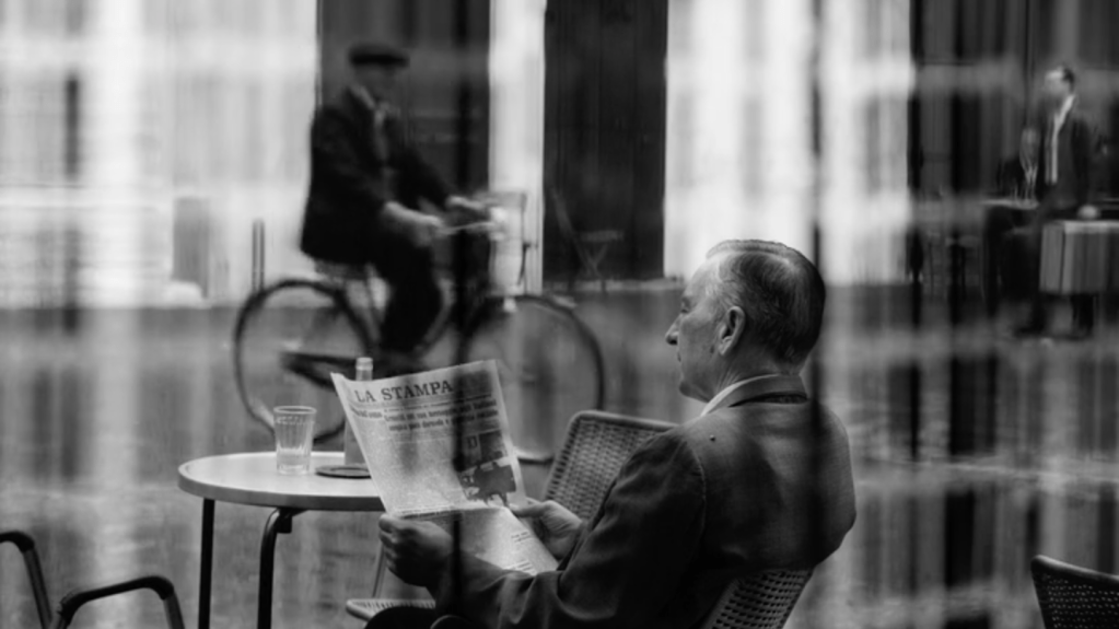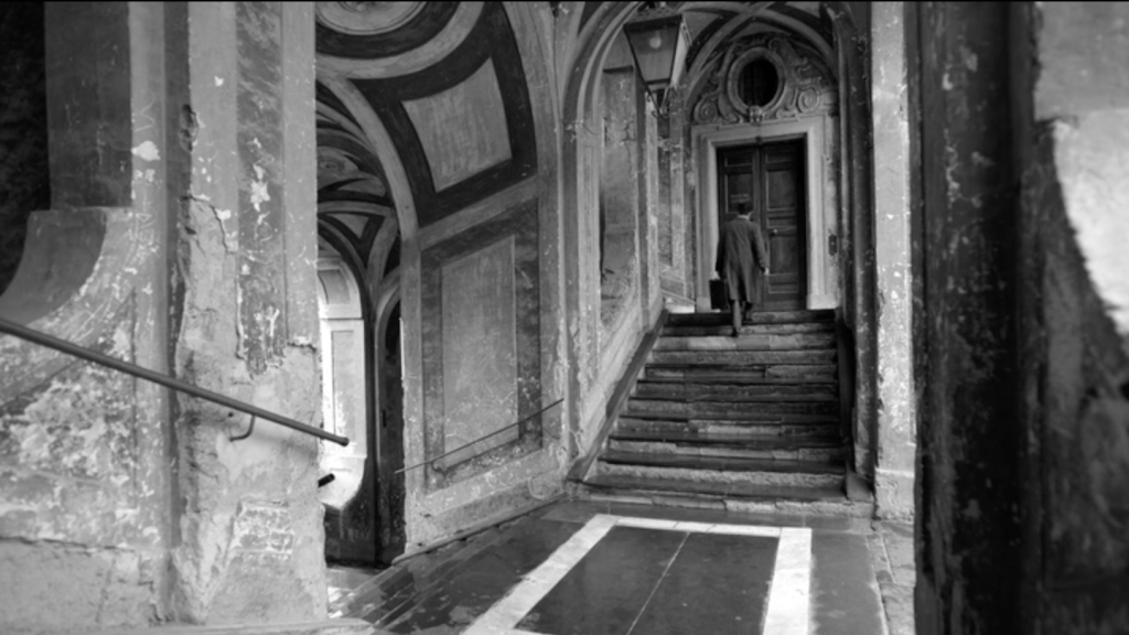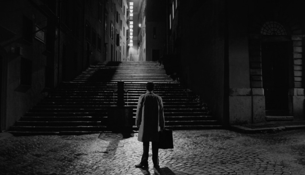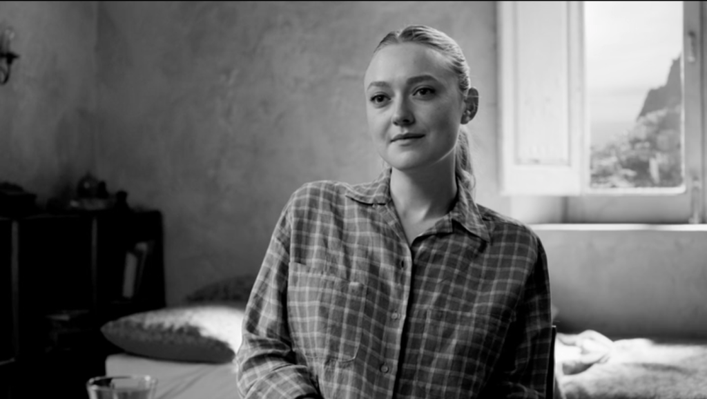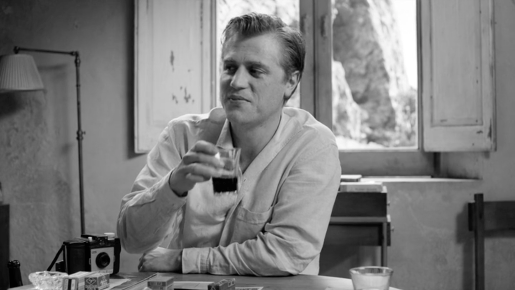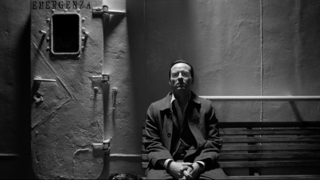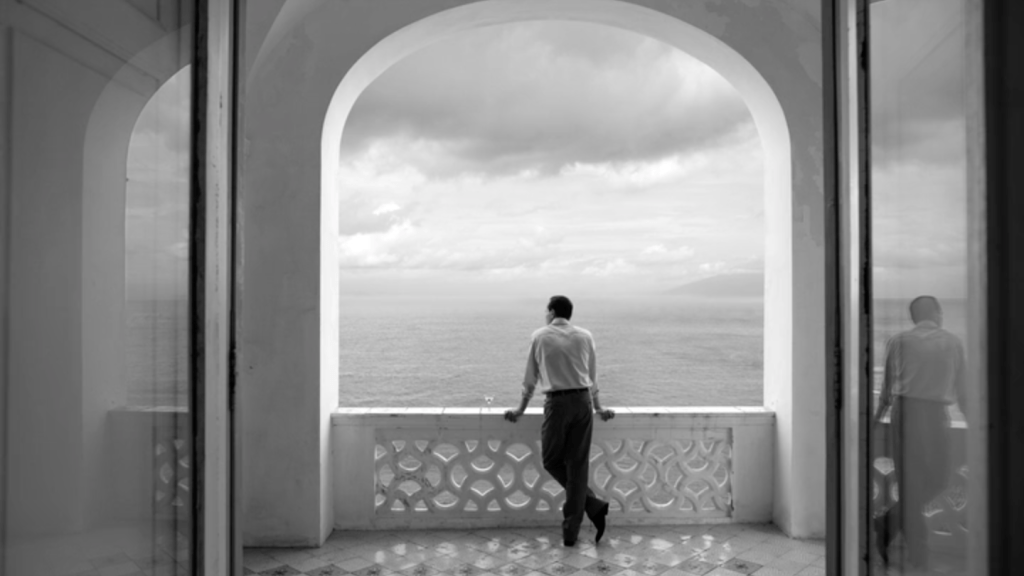 Ripley est en noir et blanc. Le noir et blanc d’Hitchcock était imposé par la technique télévisuelle de l’époque, recourir au noir et blanc à la fin du premier quart du XXIe siècle, est une affirmation esthétique. J’aurais instinctivement applaudi à ce choix, tant la défense du noir et blanc me tient à coeur. Mais ce noir et blanc là, celui du chef opérateur Robert Elswit, n’est pas celui d’Hitchcock. Pour en donner une idée, on pourrait feuilleter quelques magazines de mode chics, où l’on trouve de ces images très contrastées, voire dramatisées, mais lisses, avec une grande profondeur de champ, vraie ou fausse, des angles excessifs et parfois des effets de filtrage pour assombrir les ciels. Le décor est l’écrin du personnage, mais aussi son révélateur. Il en exprime les états d’âme, il le dissimule parfois ou le réduit à un accessoire. Le lisse des gris de l’image est le lisse du visage indéchiffrable de Tom Ripley. Les cadres sont strictement fixes, les acteurs tiennent leur pose, sans mouvement inutile. Le temps est suspendu.