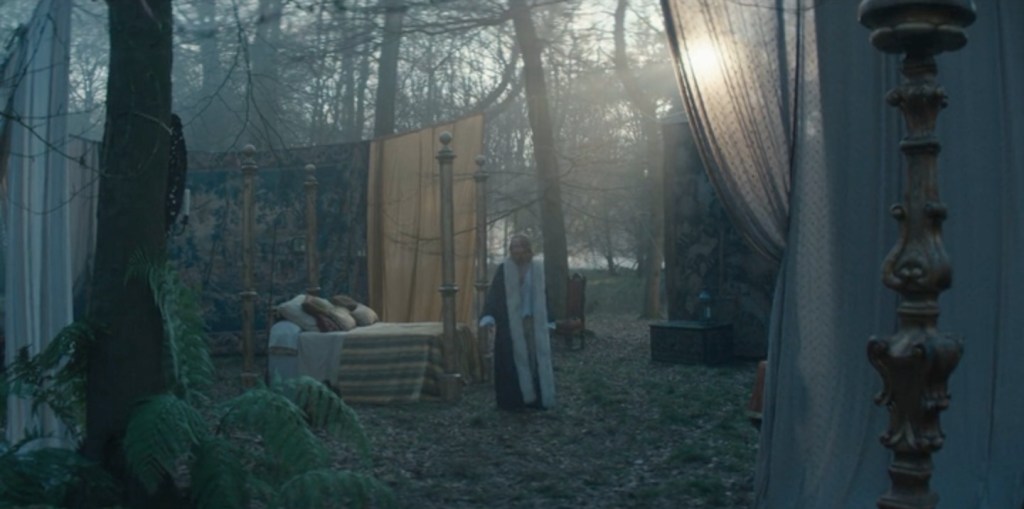 Et puis il y a ces nombreuses scènes de spectacles, de ballets pour l’essentiel, qui animent la vie de la Cour. Vers la fin de sa vie, George offre au Roi une sorte de palais des courants d’air, en pleine forêt, constitué de voiles de couleurs accrochés aux branches des arbres, d’un lit somptueux et de bougies. C’est le palais dont avait toujours rêvé le Roi. Spectacle dans le spectacle, spectacle du pouvoir subjugué par sa propre mise en scène, tout est théâtre. Shakespeare approche.