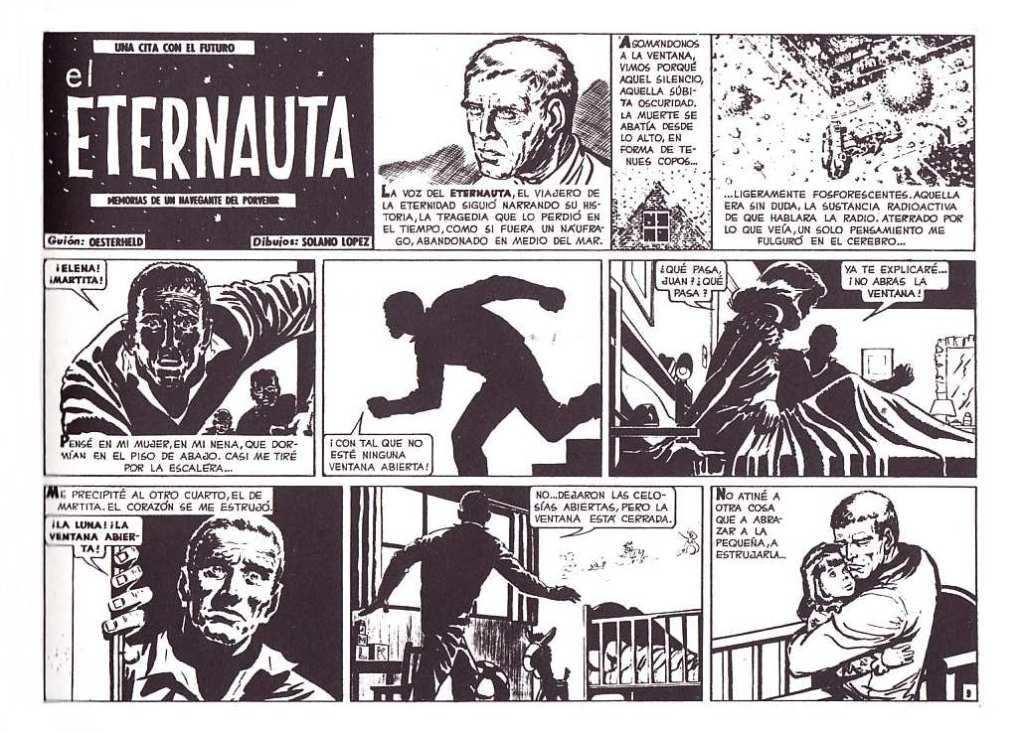 Notes : 1 – Solano López était assisté par Julio Schiaffino et un jeune apprenti, chargés d’ arrière-plans et de paysages. Il s’appelait José Muñoz et deviendra des années plus tard le célèbre dessinateur de la bande dessinée Alack Sinner, sur des scénarios de Carlos Sampayo. 2 – Cité par Fernando Garcia et Hernán Ostuni dans leur article El Eternauta, numéro 7 de la Revista latinoamericana de estudias sobre la historieta. 3 – FranceTv Info . 4 – Entre 1946 et 1958 les USA ont effectué 23 explosions nucléaires dans l’attol de Bikini, puis entre 1966 et 1974, la France a procédé à 46 tirs à Moruroa et Fangataufa. 5 – Parc construit sur la pente d’une colline dans le quartier de Belgrano. 6 – Célèbre équipe de football. 7 – Idem note n°2.
