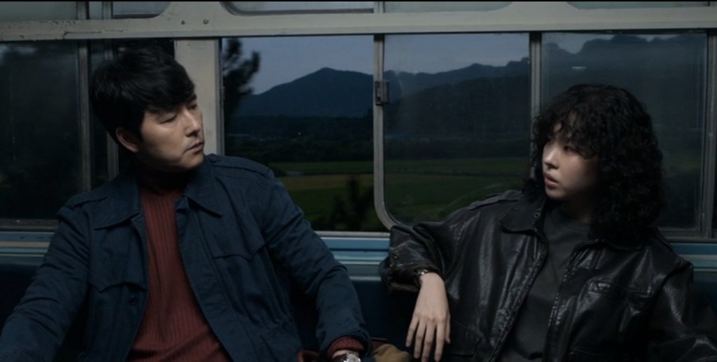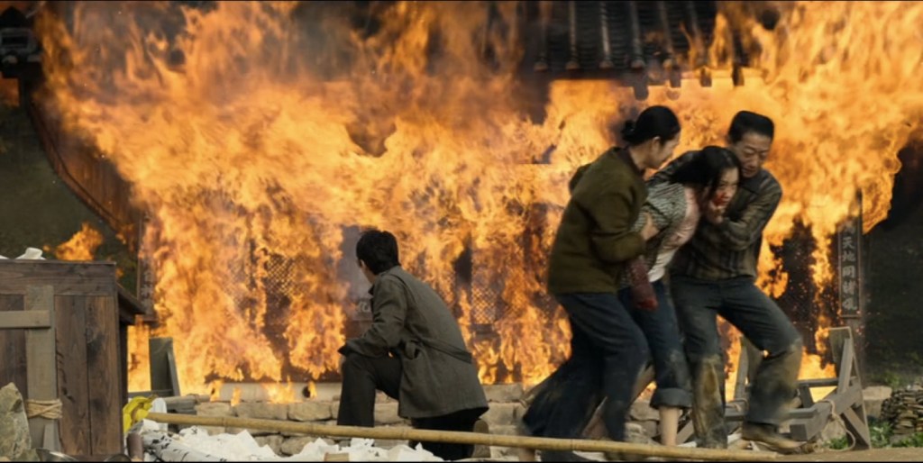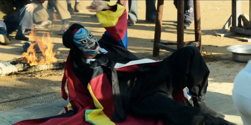 Une autre façon d’envisager le comportement du procureur est de le relier à une séquence étrange où il poursuit Bae Ki-tae dans un temple au seuil duquel se tient une cérémonie chamanique. Celle-ci dégénère, le chaman une fois masqué est agressé par une jeune femme en transes qui est ensuite maîtrisée par sa famille tandis que le temple s’embrase, incendié par Bae pour couvrir sa fuite. On imagine mal séquence plus hétérogène au récit où elle ne joue aucun rôle sinon celui de laisser la folie y faire irruption. Tout comme les rires tonitruants de Jang rompent les conversations ou mettent fin à des situations. Tout comme la bande d’illuminés de la Fraction Armée Rouge dans l’avion.