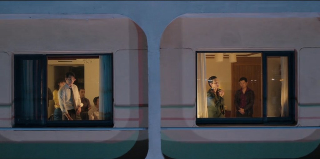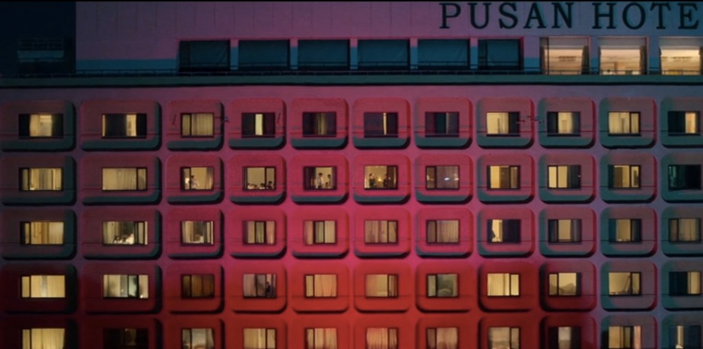 De haut en bas : Jang surveille un suspect de sa voiture, Jang vient à bout d’un agresseur, plan large d’un hôtel où l’équipe de Jang espionne une rencontre entre mafieux, zoom avant sur les fenêtres des deux chambres.
